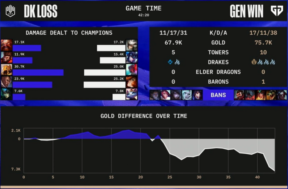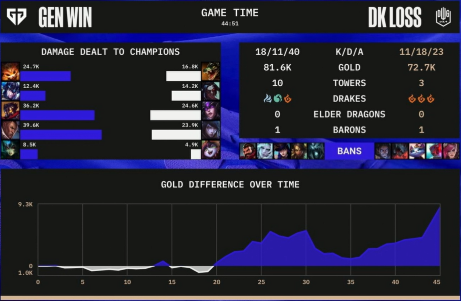 17분 전까지만 해도 3데스를 기록하며 리산드라에게 CS를 비롯한 성장이 밀리던 라이즈가 그 장면 하나로 인해 폭발적으로 성장하며 담원을 두들겨 패버렸습니다. 담원의 케인 픽 전략은 좋았으나, 순간의 아쉬운 판단이 게임을 그르치게 만들었네요. 그리고, 리헨즈에게 유미를 풀어준 밴픽 전략은 루시안 나미가 바텀 2대2 라인전에서부터 완벽하게 밀리면서 완전한 오판이었다는 것을 보여주게 됐습니다.