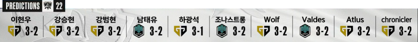 젠지는 2022 LCK 서머 시즌 결승에서 스프링 압도적 1황이었던 T1을 3대0으로 셧아웃시키고 우승컵을 들어올리며, 정말 막강한 슈퍼팀이 되었다는 평가를 받았습니다. 또한, 이번 롤드컵을 준비하는 과정에서 진행된 여러 팀들 간의 스크림에서 젠지가 완전한 1황의 모습을 보였다는 썰까지 흘러 나오면서 이번 롤드컵 우승컵이 젠지의 손에 들어가겠다는 의견이 많았습니다. 담원 기아는 LCK에서 시즌 중 부진한 모습을 적잖이 보여주긴 했으나, 적어도 젠지를 상대할 때만큼은 무조건 풀세트 접전으로 이끌고 가며 팽팽히 맞서는 경기력을 드러낸 바가 종종 있습니다. 그리고 이번 롤드컵 그룹스테이지에서도 담원은 결국 LCK 시즌 중보다 더 향상된 모습을 보이는 데에 성공했습니다. 젠지의 승리를 예상하는 비중이 상대적으로 높긴 하지만 이 두 팀의 역대 매치 기록이 죄다 접전이었던만큼, 한 팀의 완승을 예상하지는 않는 의견들을 많이 볼 수 있었습니다. 국내외 해설진들의 승부 예측입니다.